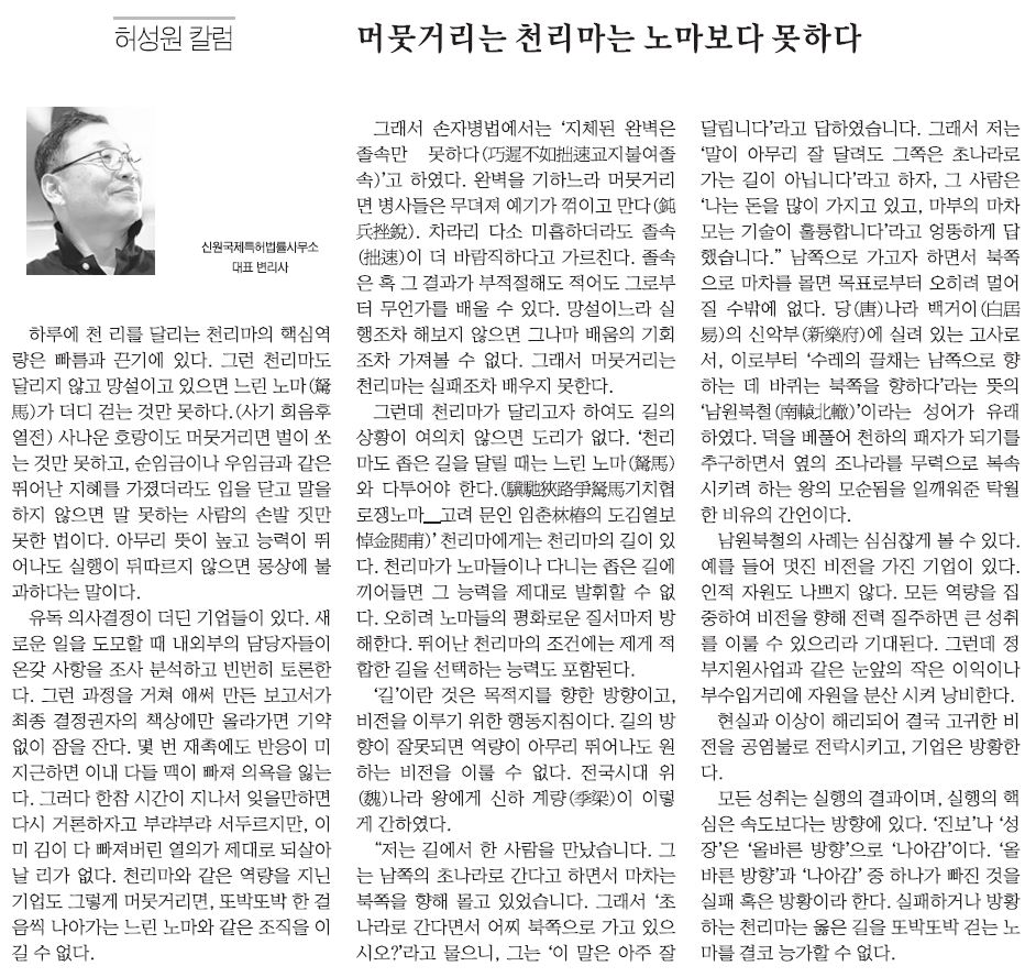 [허성원 변리사 칼럼] #10 머뭇거리는 천리마는 노마보다 못하다.