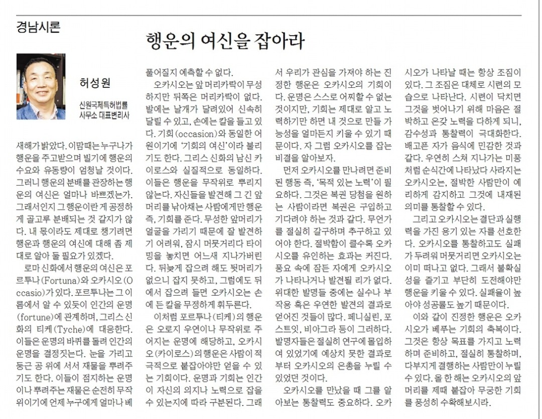 이와 같이 진정한 행운은 오카시오가 베푸는 기회의 축복이다. 그것은 항상 목표를 가지고 노력하며 준비하고, 절실히 통찰하며, 다부지게 결행하는 사람만이 누릴 수 있다. 올 한해는 오카시오의 앞머리를 제때 붙잡아 무궁한 기회를 풍성히 수확해보시라.