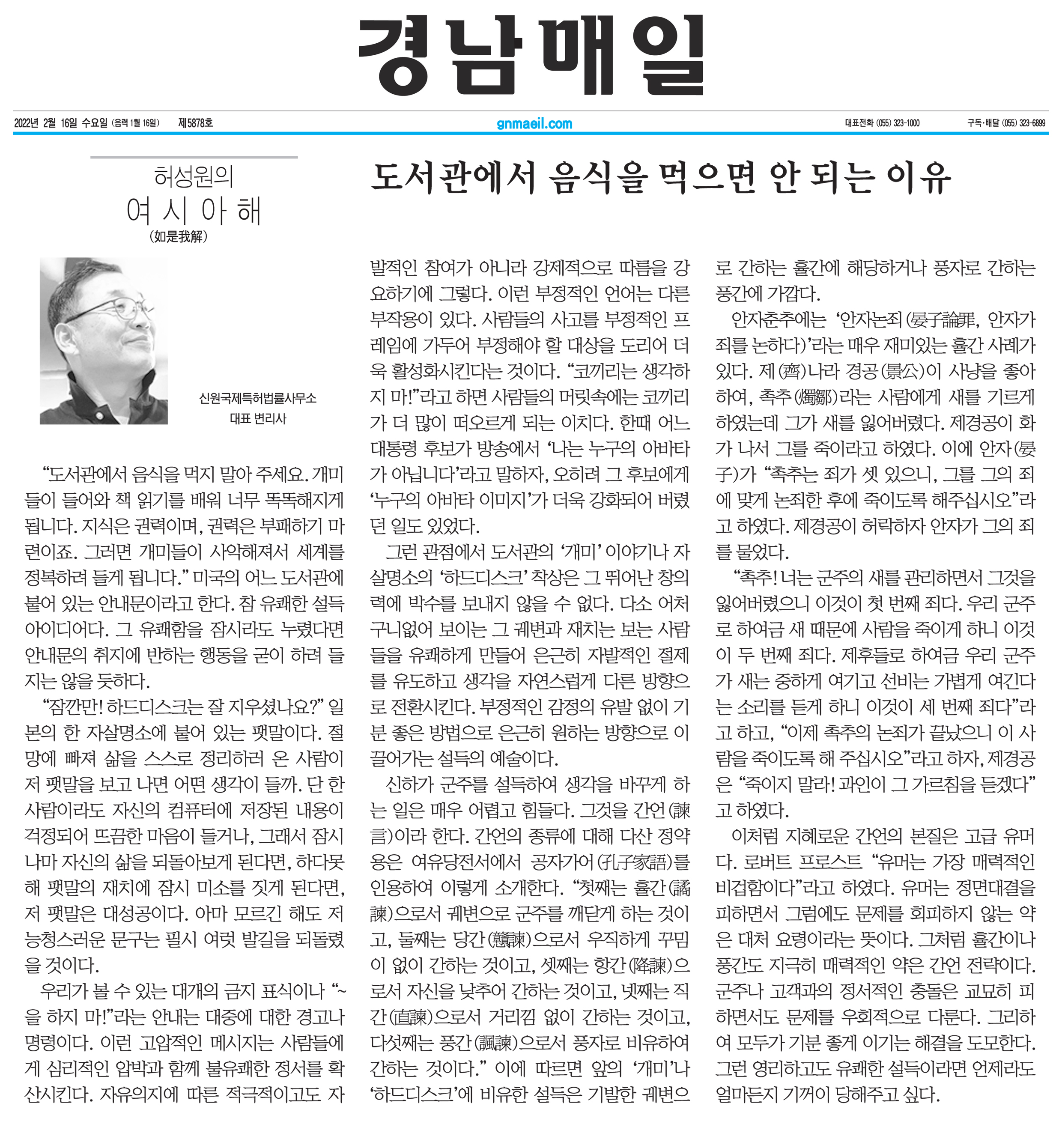 “도서관에서 음식을 먹지 말아 주세요. 개미들이 들어와 책읽기를 배워 너무 똑똑해지게 됩니다. 지식은 권력이며, 권력은 부패하기 마련이죠. 그러면 개미들이 사악해져서 세계를 정복하려들게 됩니다.” 미국의 어느 도서관에 붙어 있는 안내문이라고 한다. 참 유쾌한 설득 아이디어다. 그 유쾌함을 잠시라도 누렸다면 안내문의 취지에 반하는 행동을 굳이 하려들지는 않을 듯하다.