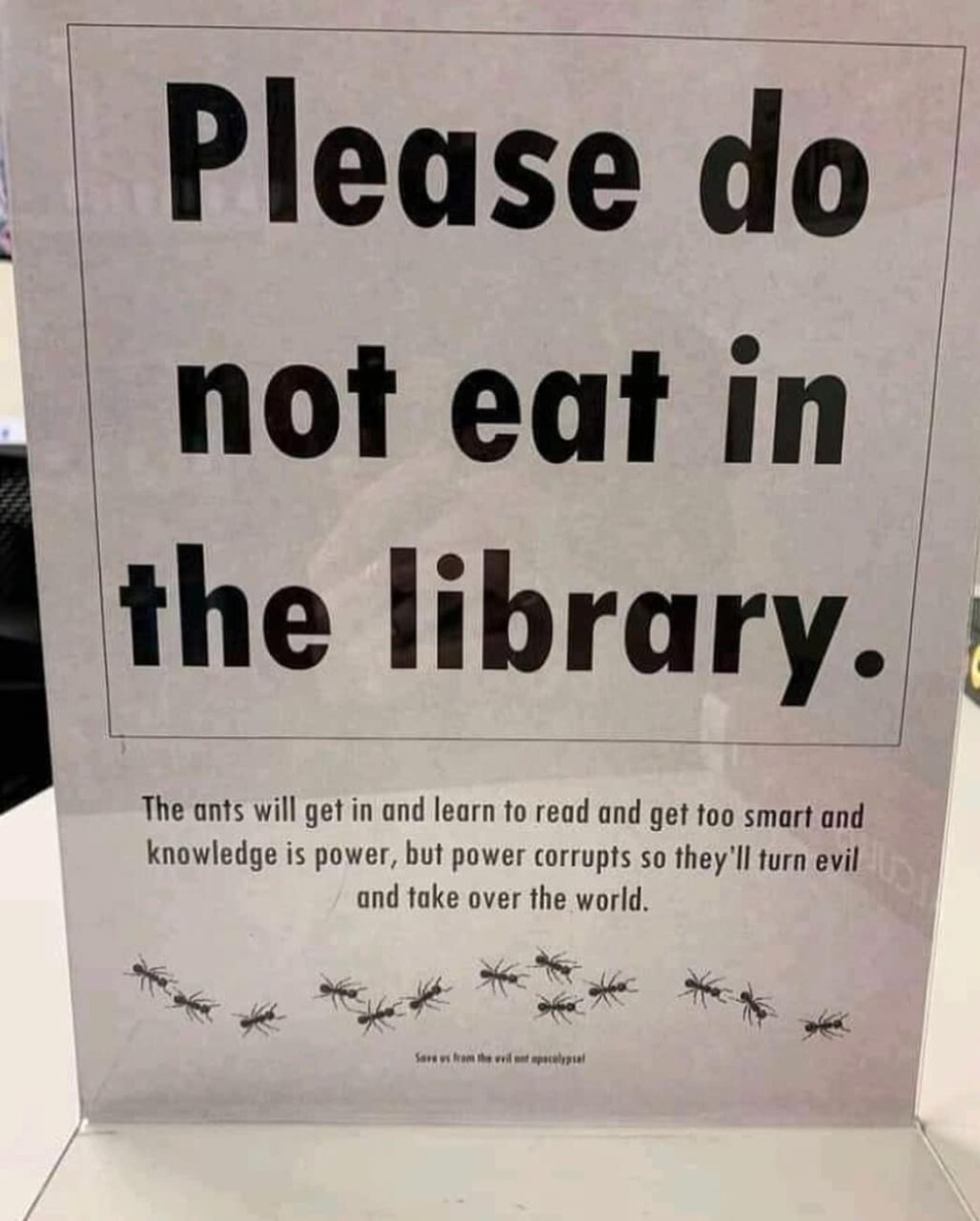 도서관에서 음식을 먹지 말아 주세요. 개미들이 들어와 책읽기를 배워 너무 똑똑해지게 됩니다. 지식은 권력이며, 권력은 부패하기 마련입니다. 그러면 개미들이 사악해져서 세계를 정복하려들게 될 겁니다.