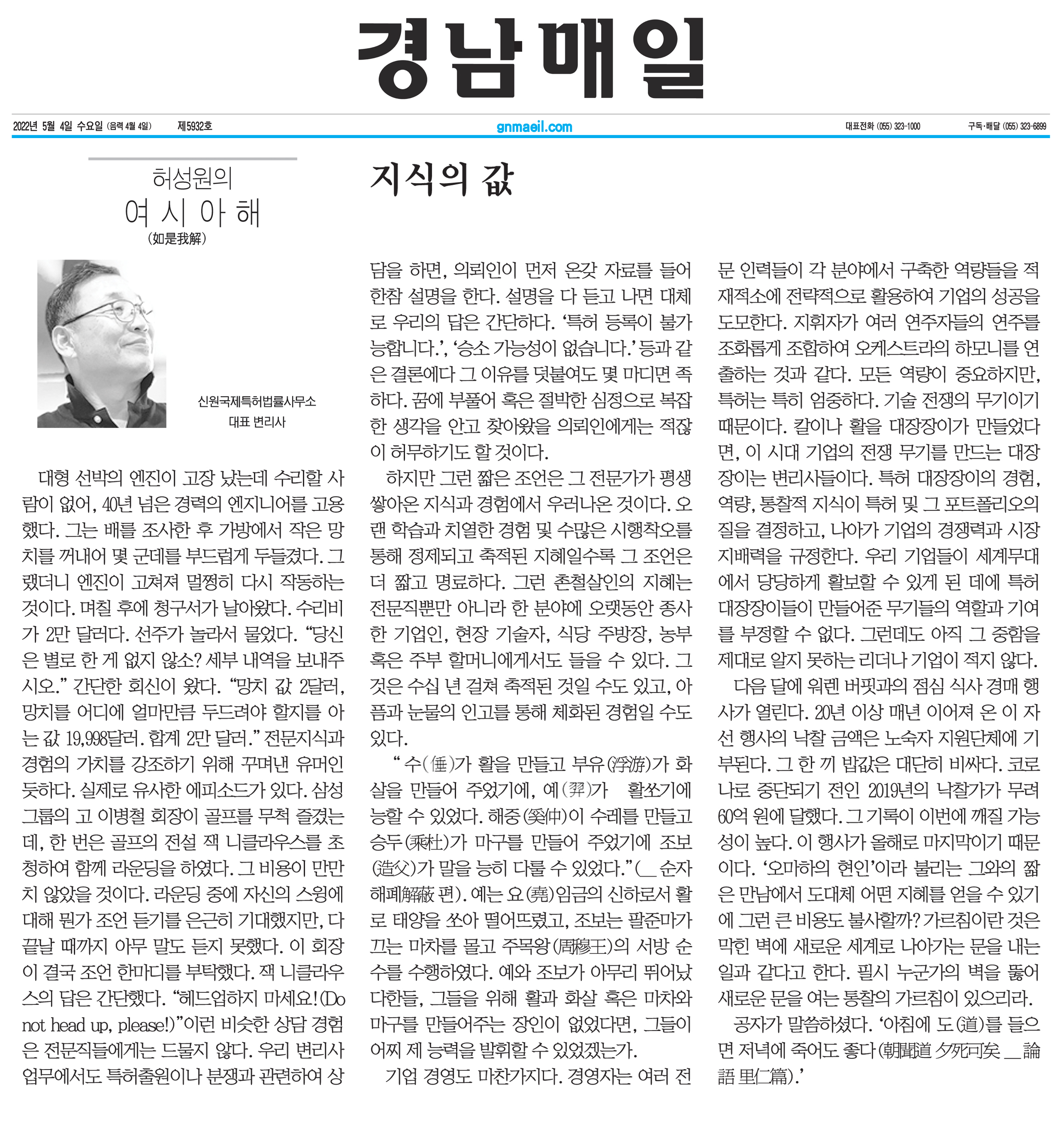기업 경영도 마찬가지다. 경영자는 여러 전문 인력들이 각 분야에서 구축한 역량들을 적재적소에 전략적으로 활용하여 기업의 성공을 도모한다. 지휘자가 여러 연주자들의 연주를 조화롭게 조합하여 오케스트라의 하모니를 연출하는 것과 같다. 모든 역량이 중요하지만, 특허는 특히 엄중하다. 기술 전쟁의 무기이기 때문이다. 칼이나 활을 대장장이가 만들었다면, 이 시대 기업의 전쟁 무기를 만드는 대장장이는 변리사들이다. 특허 대장장이의 경험, 역량, 통찰적 지식이 특허 및 그 포트폴리오의 질을 결정하고, 나아가 기업의 경쟁력과 시장지배력을 규정한다. 우리 기업들이 세계무대에서 당당하게 활보할 수 있게 된 데에 특허 대장장이들이 만들어준 무기들의 역할과 기여를 부정할 수 없다. 그런데도 아직 그 중함을 제대로 알지 못하는 리더나 기업이 적지 않다.