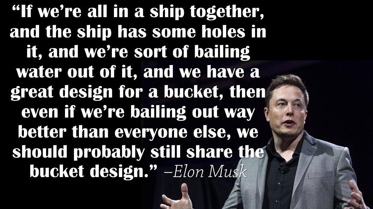 "우리가 함께 배를 타고 있다고 생각하자. 배에는 몇 개의 구멍이 나있어 물을 퍼내야 한다. 우리가 가진 양동이의 디자인이 매우 뛰어나다. 이것으로 우리가 남들보다 물을 잘 퍼낼 수 있다 하더라도, 그 양동이 디자인을 함께 써야 하지 않겠는가."