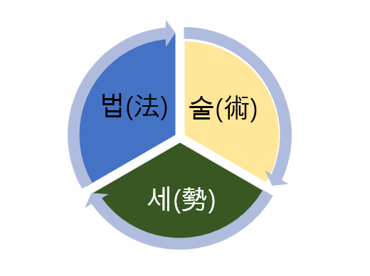| 술 (術, Technique) | 군주가 신하를 은밀히 제어하는 권모술수. 겉으로 드러나지 않는 통치 기교로서, 신하의 충성도 시험, 권한 분산 방지, 정보 조작 등을 포함. 법을 보완하고 세를 유지하는 전략적 기술. | 리더십 스킬과 조직 정치술.사람을 다루는 섬세한 기법들 – 동기부여, 갈등관리, 정보관리, 인사이동 등. 공식 규범 밖에서 리더가 발휘하는 전략적 조치들로, 조직의 실질적 분위기와 동력을 통제. Ex) 핵심 인재를 적재적소 배치, 성과 경쟁 유도, 내부 정보의 선택적 공개. |