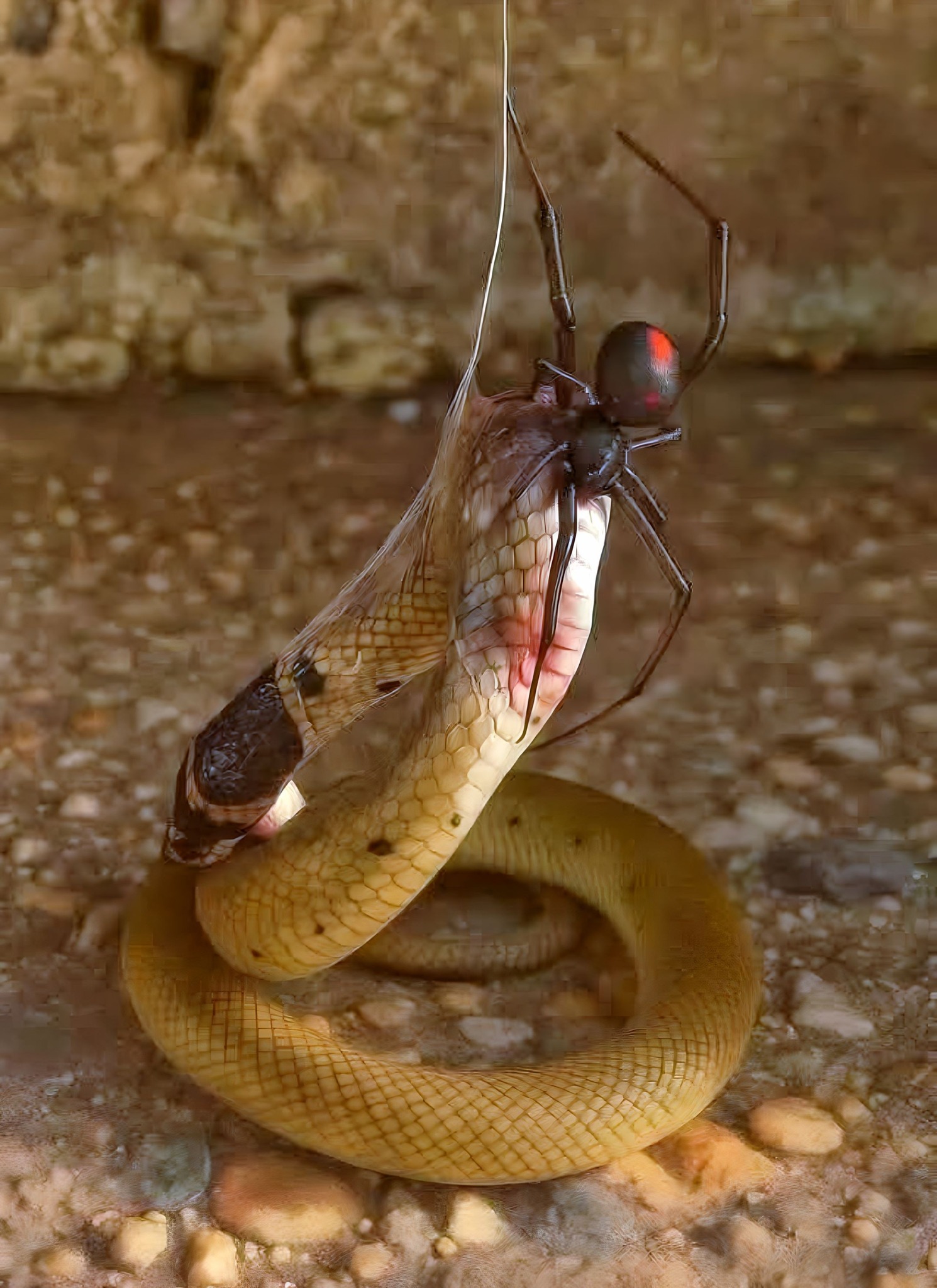 간혹 거미줄에 걸려 거미의 먹이가 되는 코브라가 있다.