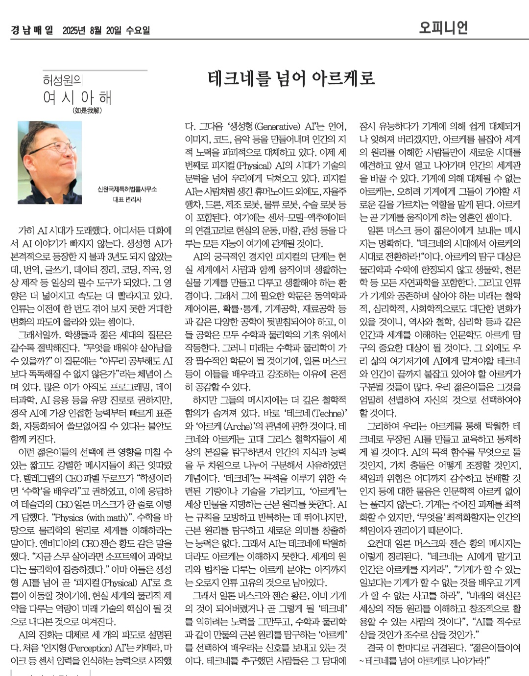 일론 머스크 등이 젊은이에게 보내는 메시지는 명확하다. “테크네의 시대에서 아르케의 시대로 전환하라!"이다. 아르케의 탐구 대상은 물리학과 수학에 한정되지 않고 생물학, 천문학 등 모든 자연과학을 포함한다. 그리고 인류가 기계와 공존하며 살아야 하는 미래는 철학적, 심리학적, 사회학적으로도 대단한 변화가 있을 것이니, 역사와 철학, 심리학 등과 같은 인간과 세계를 이해하는 인문학도 아르케 탐구의 중요한 대상이 될 것이다. 그 외에도 우리 삶의 여기저기에 AI에게 맡겨야할 테크네와 인간이 끝까지 붙잡고 있어야 할 아르케가 구분될 것들이 많다. 우리 젊은이들은 그것을 엄밀히 선별하여 자신의 것으로 선택하여야 할 것이다.