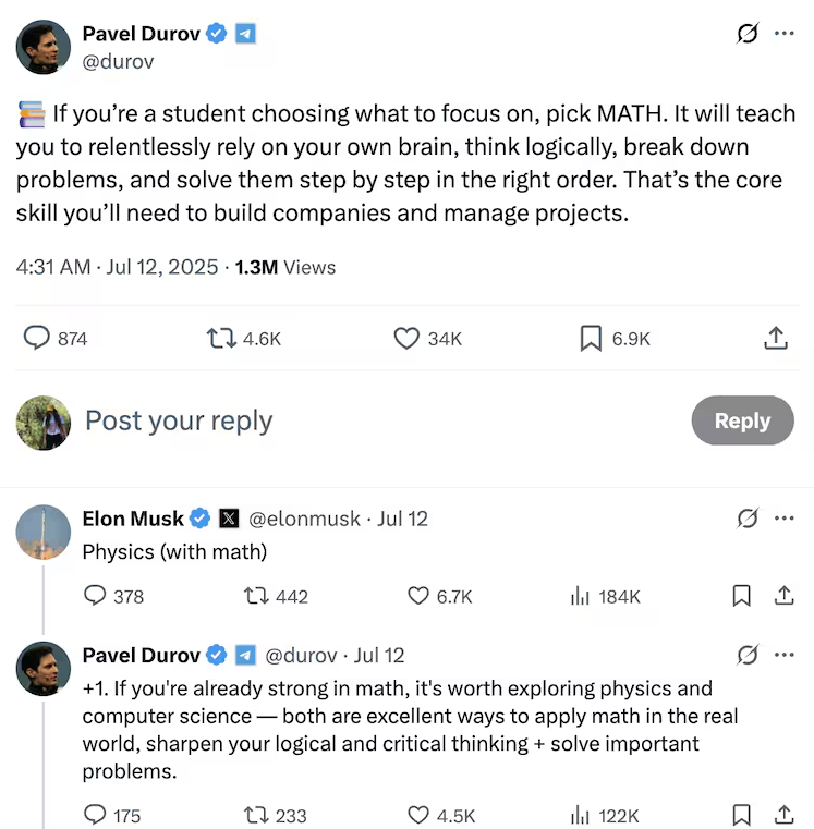 이런 젊은이들의 선택에 큰 영향을 미칠 수 있는 짧고도 강렬한 메시지들이 최근 잇따랐다. 텔레그램의 CEO 파벨 두로프가 “학생이라면 ‘수학’을 배우라”고 권하였고, 이에 응답하여 테슬라의 CEO 엘론 머스크가 한 줄로 이렇게 답했다. “Physics (with math)”. 수학을 바탕으로 물리학의 원리로 세계를 이해하라는 말이다. 엔비디아의 CEO 젠슨 황도 같은 말을 했다. “지금 스무 살이라면 소프트웨어 과학보다는 물리학에 집중하겠다.” 아마 이들은 생성형 AI를 넘어 곧 ‘피지컬(Physical) AI’로 흐름이 이동할 것이기에, 현실 세계의 물리적 제약을 다루는 역량이 미래 기술의 핵심이 될 것으로 내다본 것으로 여겨진다.