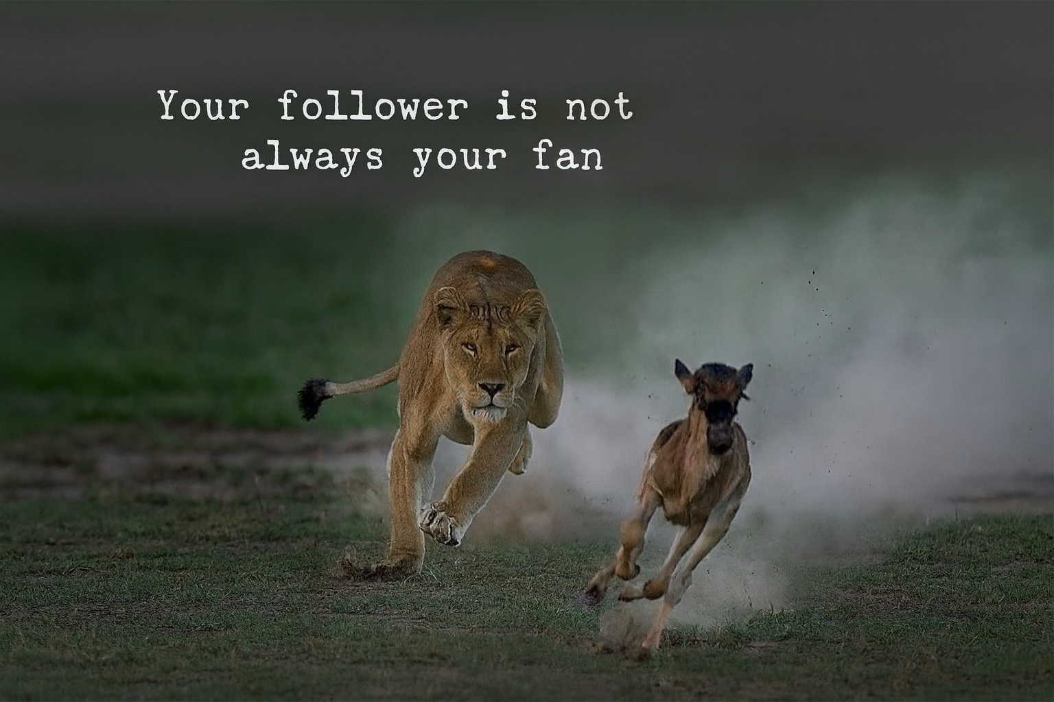 (** 무서운 기세로 추격하는 사자와 필사적으로 도망치는 새끼 사슴의 모습을 그린 장면에 'Your follower is not always your fan'이라는 문구가 적힌 그림이 있다. 사자가 사슴을 뒤를 쫓는 것은 사슴에 대한 존경심이나 충성심의 발로가 아니라 그저 한 끼 배를 채우기 위한 목적이듯이, 사슴이 사력을 다해 달리는 것은 자신의 목숨을 구하기 위한 절실한 생존본능이다. 여기에는 오직 먹느냐 먹히느냐, 한끼 식사냐 생존이냐의 비정한 긴장만이 존재한다.