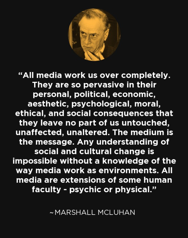 (* 캐나다의 문명 비평가인 마셜 맥루한은 1964년 저서 『미디어의 이해: 인간의 확장』에서 "미디어는 메시지다(The medium is the message)"라고 주장하였다. 이는 콘텐츠의 중요성을 넘어 매체 자체의 본질적 속성이 갖는 힘에 주목해야 한다는 혁신적인 주장이었다. 인간의 관계와 행동의 탐색과 형식을 형성하고 통제하는 것은 바로 그 매체이기 때문이다.