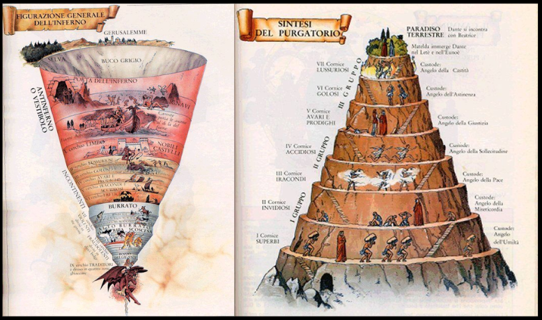 지옥은 하강하는 깔때기 모양의 9개 원으로 구성되어 있다.6 이 구조는 죄의 경중이 깊어질수록 영혼이 신에게서 멀어진다는 상징성을 갖는다. 지옥에서 죄는 무절제, 폭력, 사기(악의)로 분류되며, 죄의 경중에 따라 하부 지옥으로 갈수록 더 큰 징벌을 받는다.6 반면, 연옥은 상승하는 피라미드 산의 7개 고리로 이루어져 있으며 12, 이는 영혼의 정화와 구원을 향한 노력을 상징한다. 연옥의 죄는 기독교의 7가지 대죄로 분류되며, 산을 오를수록 죄가 씻겨 나간다.12
