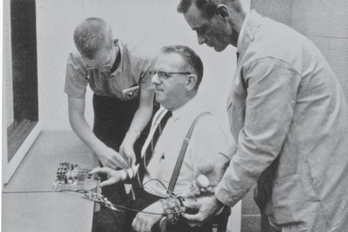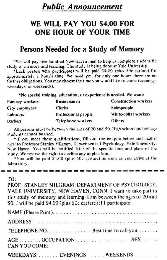 1961년 예일 대학교에서 수행된 스탠리 밀그램의 복종 실험은 학습에 대한 체벌의 영향을 연구하는 것처럼 위장하여 진행되었다.8 실험 참가자(교사 역할)는 권위자로 보이는 실험자의 지시에 따라, 기억력 테스트에서 오답을 말하는 다른 참가자(학생 역할, 실제로는 연기자)에게 전기 충격을 가하도록 요구받았다. 충격의 강도는 15볼트부터 450볼트까지 점진적으로 증가하도록 설계되었다.9 밀그램은 대다수의 사람들이 도덕적 양심에 따라 중간에 실험을 중단할 것이라고 예상했지만, 결과는 충격적이었다. 65%에 달하는 참가자가 상대방이 고통을 호소하는 상황에서도 최고 전압인 450볼트까지 전압을 올리는 데 복종했다.9