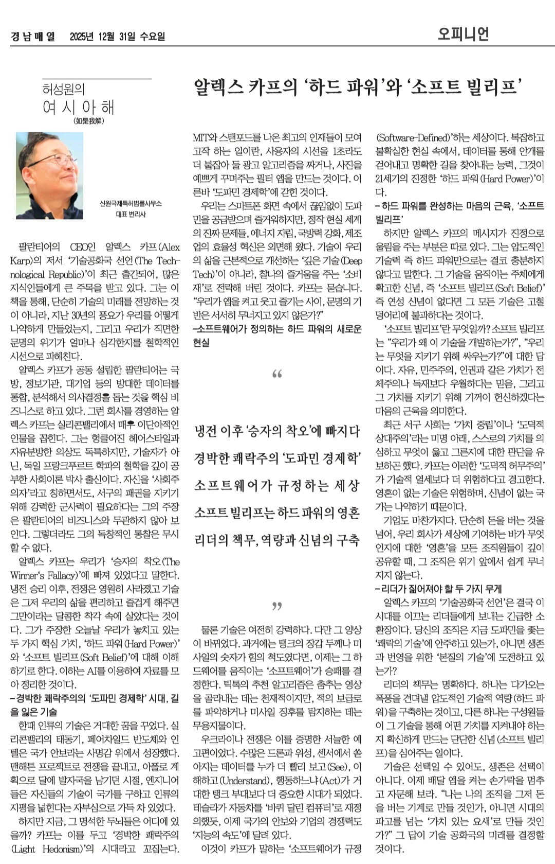 하지만 알렉스 카프의 메시지가 진정으로 울림을 주는 부분은 따로 있다. 그는 압도적인 기술력 즉 하드 파워만으로는 결코 충분하지 않다고 말한다. 그 기술을 움직이는 주체에게 확고한 신념, 즉 '소프트 빌리프(Soft Belief)' 즉 연성 신념이 없다면 그 모든 기술은 고철 덩어리에 불과하다는 것이다.