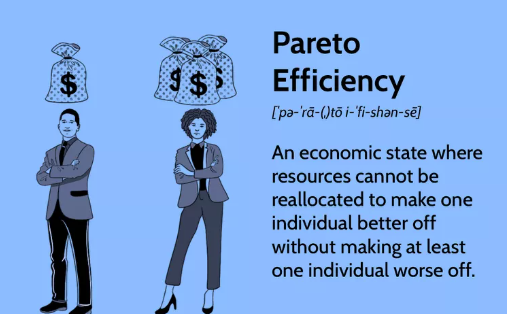 (* '파레토 최적'이란 자원 배분 상태에서 다른 사람에게 손해가 가도록 하지 않고서는 어떤 한 사람의 이득을 증가시키는 변화를 만들어낼 수 없는 상태를 의미한다. 즉, 사회 내의 모든 자원이 낭비 없이 완전히 활용되어, 누군가의 효용을 증가시키려면 반드시 다른 누군가의 효용을 희생시켜야만 하는 상태가 바로 파레토 최적이다.