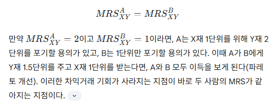| 교환의 효율성 | 소비 배분의 최적화 | $MRS_{XY}^A = MRS_{XY}^B$ | 소비자의 주관적 교환비율 일치 |