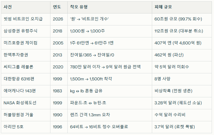 최근 2026년 2월 6일 가상자산 거래소 '빗썸'에서 이벤트 당첨금 '62만원'을 지급하려다 '비트코인 62만개'(약 60조원어치)를 잘못 지급한 사고가 있었다. '원' 단위를 '비트코인 개수'로 잘못 입력한 단순 실수가 야기한 참사였다.
