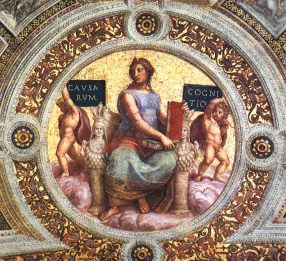 아테네 학당의 천장화는, 가운데의 여신이 'NATURALIS'(자연)와 'MORALIS'(도덕)라는 이름의 책을 들고 있고, 양측의 천사는 'CAUSARUM'(원인, 이유)과 'COGNITIO'(인식, 지식)이라는 글자판을 각각 들고 있다.